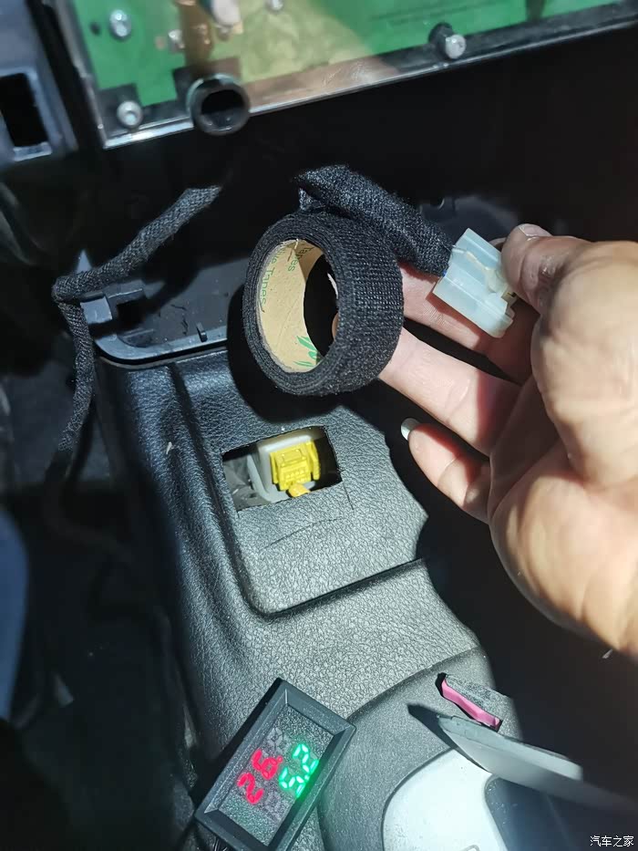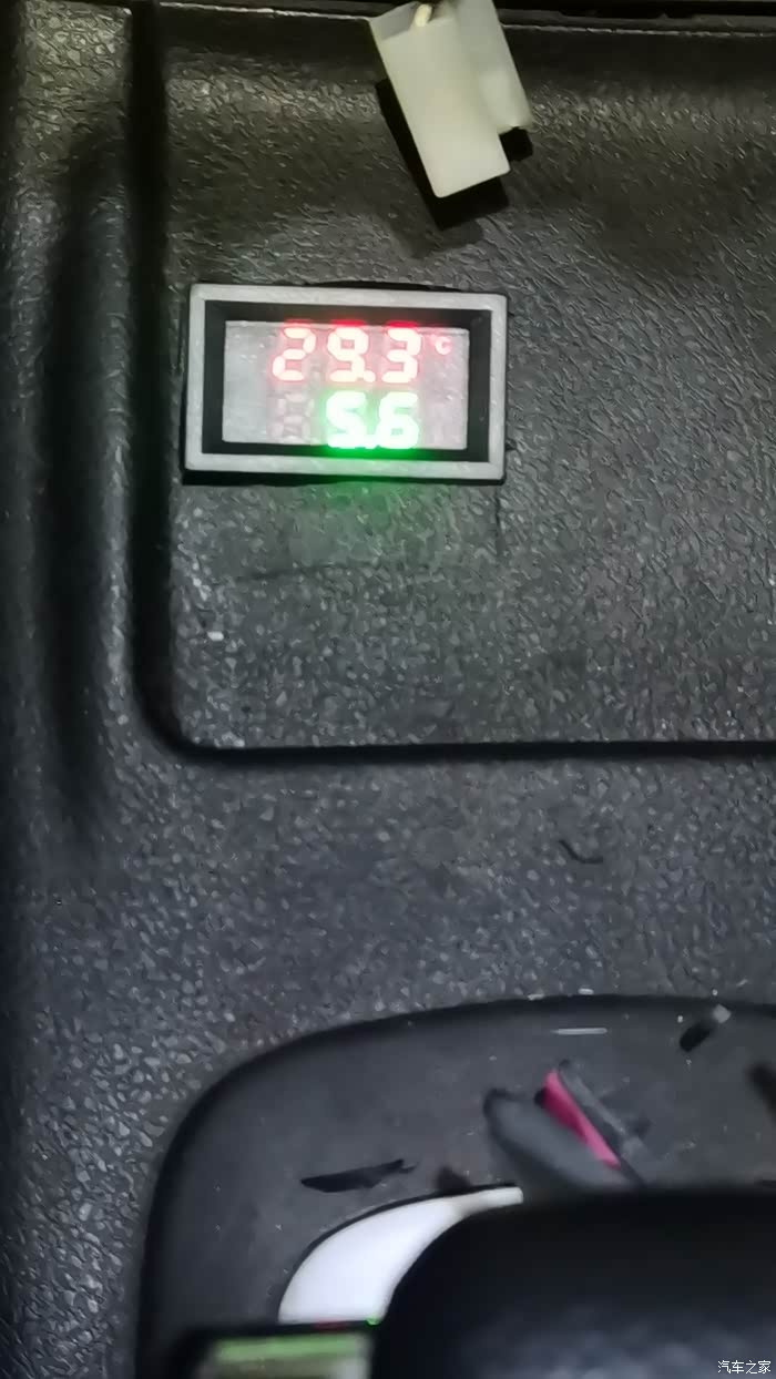 打开钥匙门到ACC档 开始供电温度表瞬间开启轮流显示实时电压和双温度,红色表显金属探针我放到脚底下出风口来测量开暖风实时温度、绿色表显金属探头放在上出风口来测量开制冷时候实时温度。