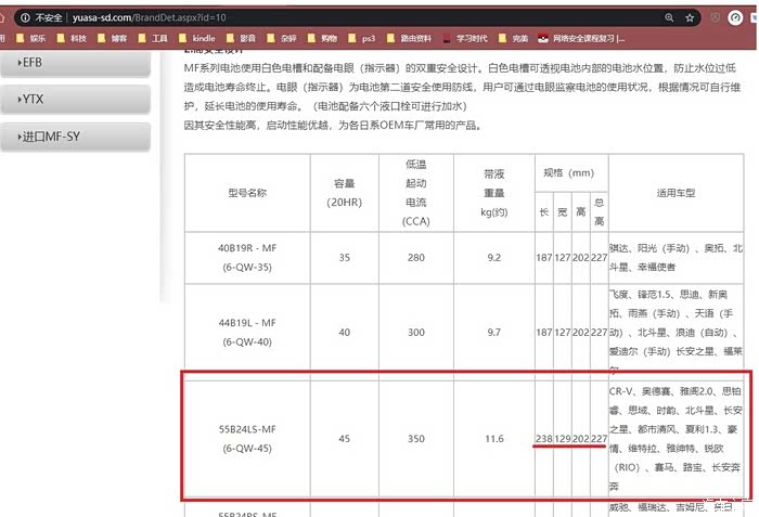 汤浅官网查原车电池尺寸,原车适配46B24LS-MF替代型号55B24LS-MF,虽然46变成55但是还是45AH。型号前面的数字不一定等于容量