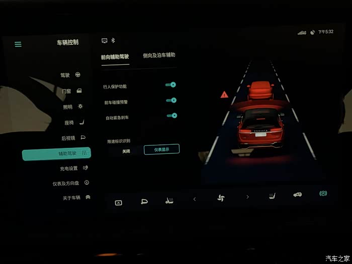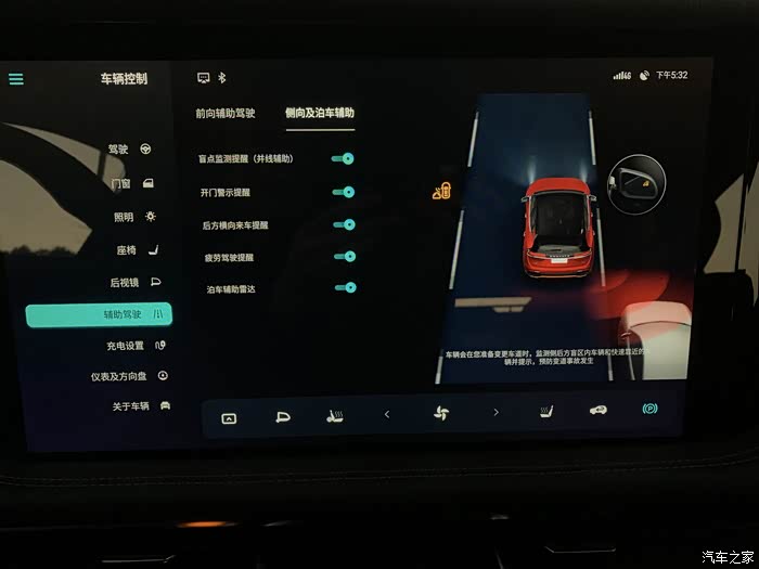 方向盘左下这个可是重头戏,辅助驾驶的拨杆,拨杆最外侧的按钮按下去是保持道路居中,这个对新手是非常有帮助的一个功能;往胸口的位置拨一下,然后再往上/下随意拨一下,开启的是跟车模式,转动拨杆,可以调节跟车距离;往胸口的位置拨两下,然后再往上/下随意拨一下,开启的是领航模式,理论上的辅助驾驶,这个在高速上特别好用,长途不会特别累,不过这里还是要提醒一下,辅助驾驶虽好,但是还是要时刻观察路面环境。