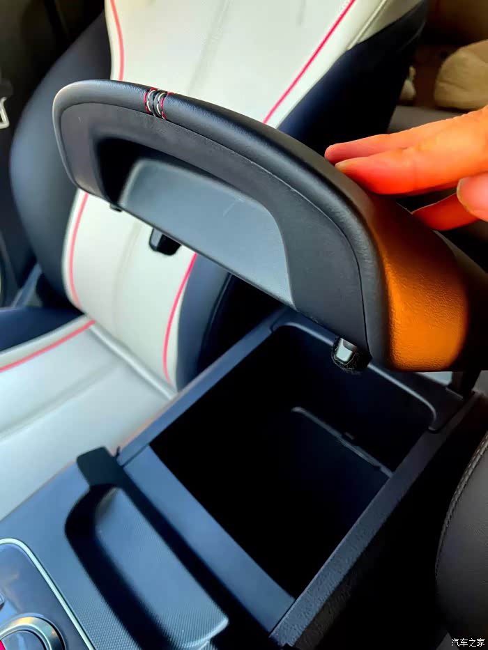 操纵台后面有一个空间较大的储物箱,对于女生来说很实用,放点随身小物品也很方便。