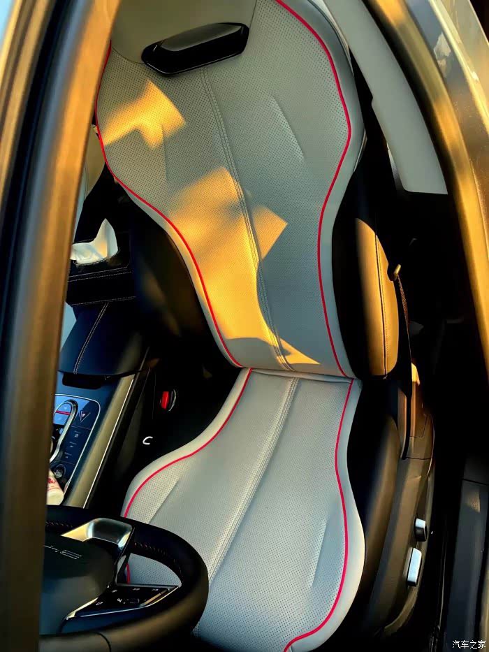 4.内饰:内饰我觉得还是比较贴近年轻人的审美的,我自己比较能够接受。皮质打孔座椅,包裹性还行,就是看不太耐脏,准备买一个座套给包起来,颜色也还挺好的。