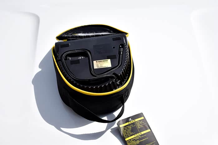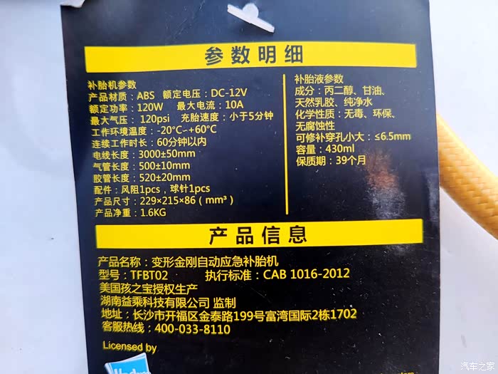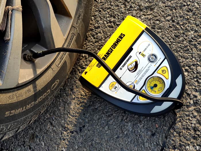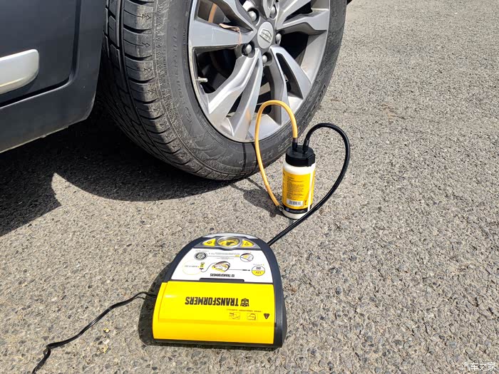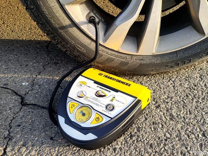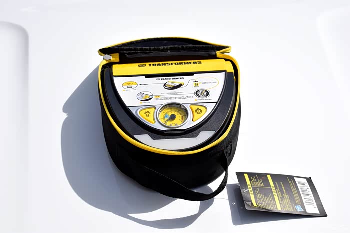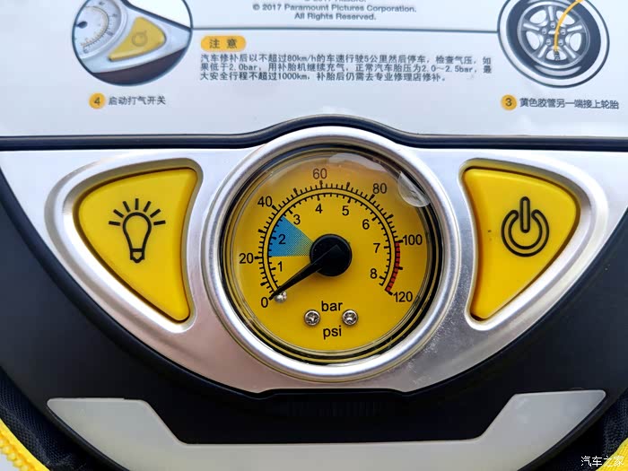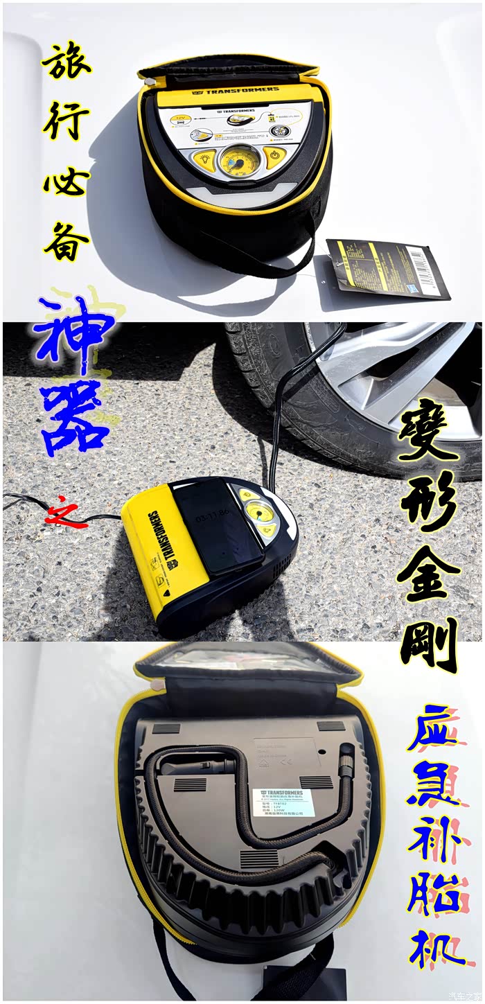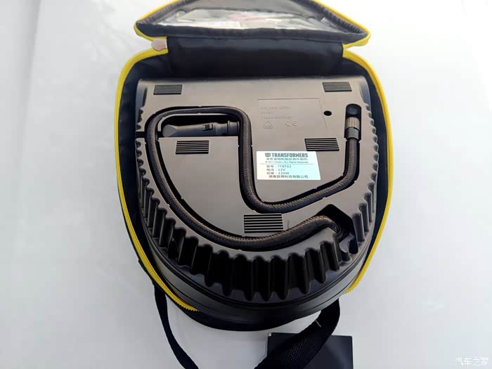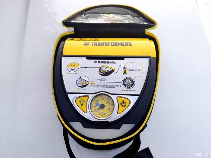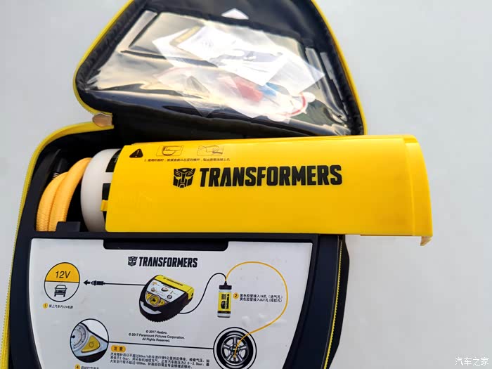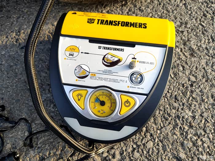 说到自动应急补胎神器,不得不说我手里这款变形金刚自动应急补胎机,此款神器完全是一款不论新手和老手司机都可以轻松搞定补胎充气的随车神器。黑银黄为主色调,特别接近于变形金刚主角大黄蜂的配色,正面包括机械胎压表、气泵开关,照明控制以及自补胎机的使用说明简图,同时补胎液及专用胶管藏于补胎机的上测,背部主要是充气管、电源线储存,都设计隐藏式的出口,方便使用,工作时不受挤压及摩擦,设计很用心。