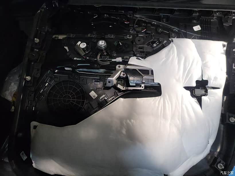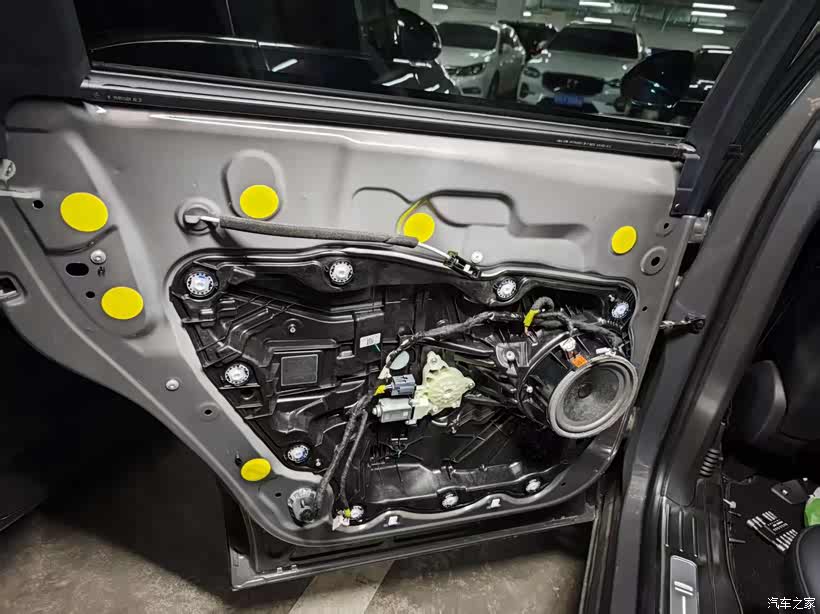 门内饰板拆下来的样子,说明高音喇叭是安在门内饰板上的,固定在车门的喇叭是低音喇叭。
