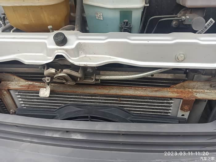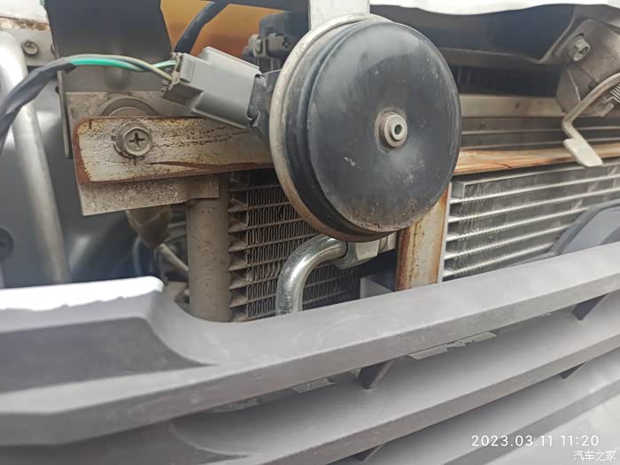 我把驻车散热器安装在原来空调散热器前边。这是驻车散热器,后边是前置空调散热器。这是现在拍的,支架有点上锈,回头把支架刷点防锈漆。