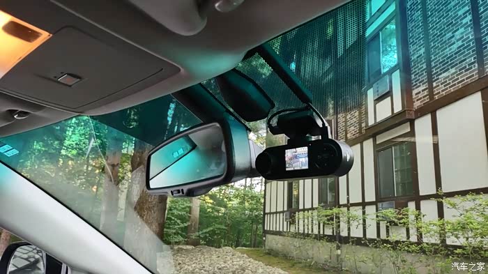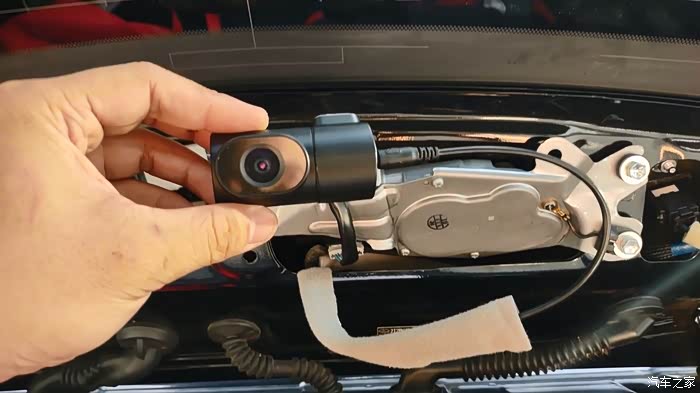 至于后摄像头,我选择了从顶棚与ABC柱连接处的缝,把线引到后门顶部。然后把线通过软管引到后门上,把后摄像头粘在了后玻璃上。在前挡风玻璃中间,我把记录仪粘在了那里,供电线和后摄像头都是Type-C的线,接上去。最后我还用了个黑色的线缆槽,把电线都整理好。