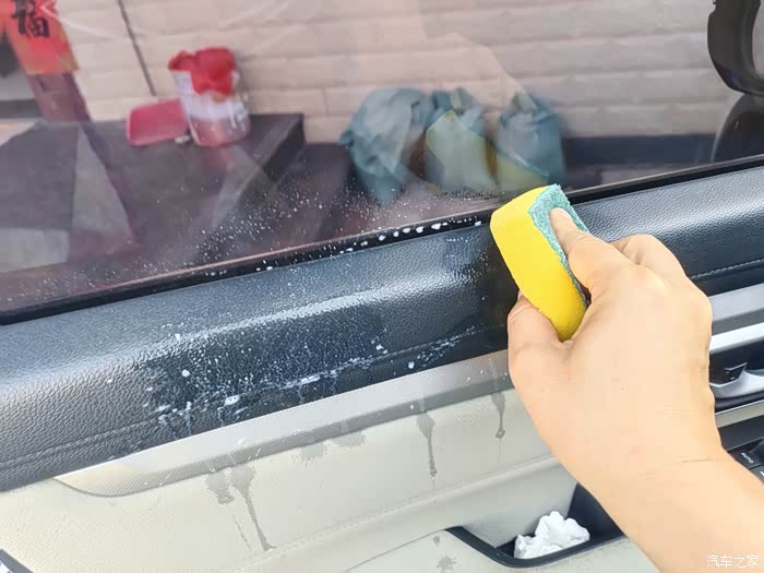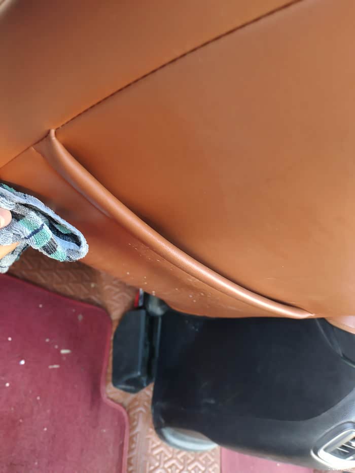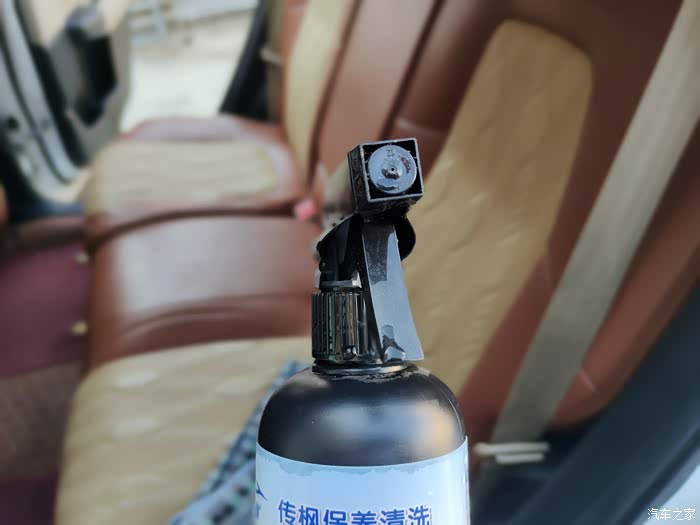 对准需要维护美容的地方喷表板蜡,然后干抹布和海绵擦拭。车辆的内部速来的地方是感觉老化了的才喷了擦一下。重点是对座椅,可以先大面积喷了以后,给表板蜡发挥作用一点时间,然后再用海绵依次擦干净。