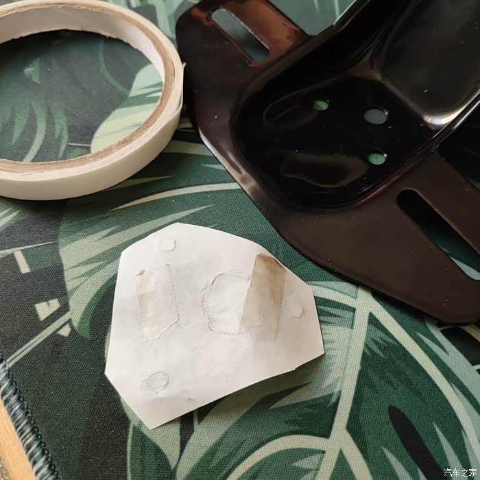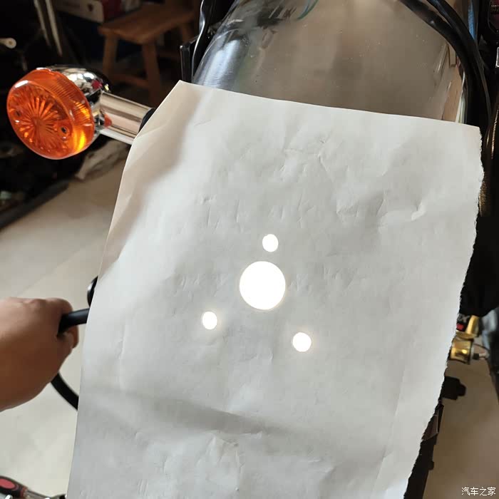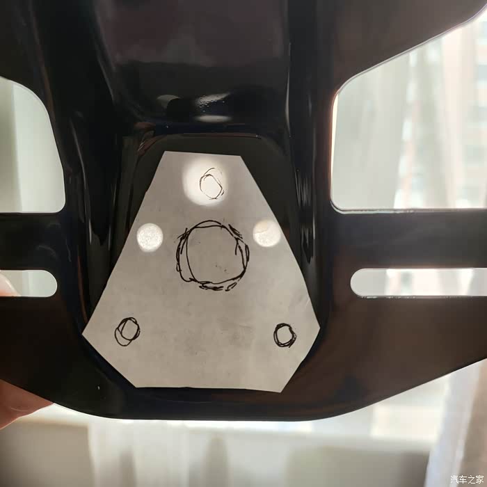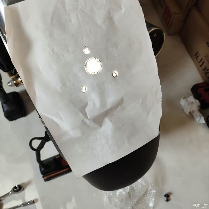 新尾灯支架对着光把孔位贴好,然后按位置打孔。