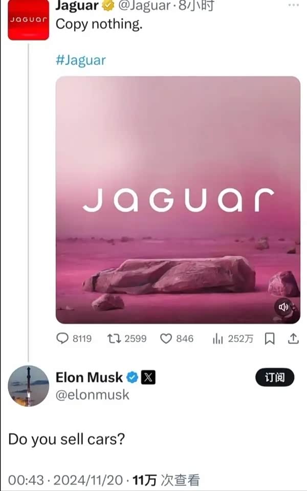 捷豹在社交媒体X上发布新品牌标识的宣传片,几乎看不到任何和车相关的元素,反而像是一场时装秀。从点赞数和评论来看,不少人对这段宣传片表示困惑和不解,认为其过于抽象,难以理解。马斯克吐槽其LOGO不像是卖车的,这一评论也得到很多网友响应,有网友调侃“我以为你们是制造汽车的,这到底是什么呀?”甚至有网友表示这段宣传片让他有了卖掉捷豹的冲动(尽管他并没有拥有过捷豹汽车),还有网友吐槽“你不了解你的市场吗?你的广告到底针对的是哪些人?肯定不是你的客户”。