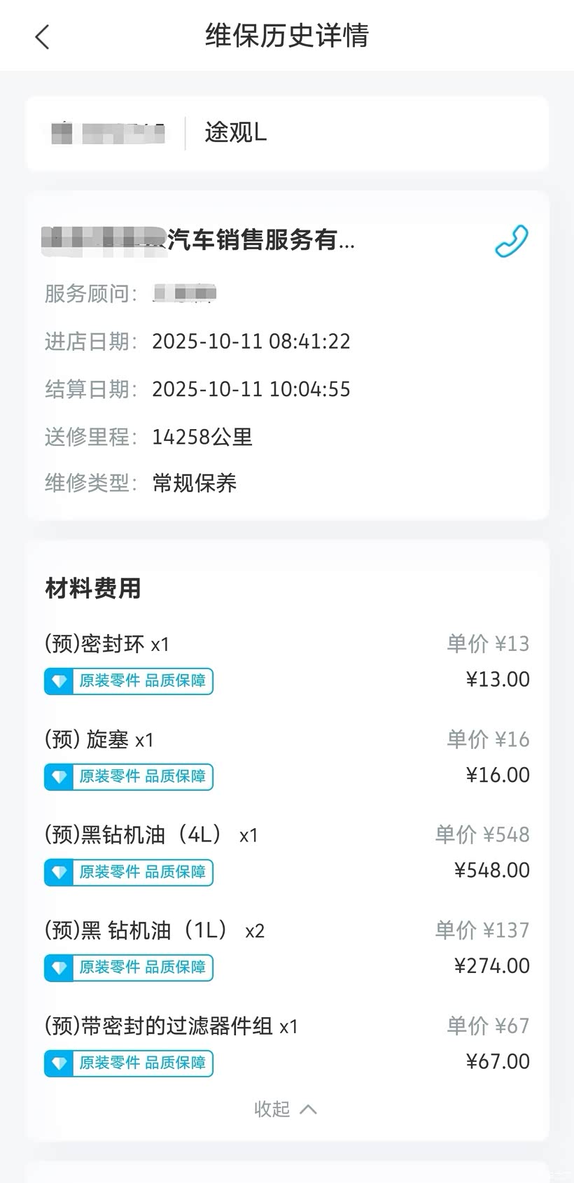 买车的时候花了1600元买了6次基础保养,正常拍不收费的,我花的460元是首保和二保升级机油的花费,首保的时候不太懂花了130升级的全合成机油,二保的时候花了230升级的黑钻级机油,效果能更好一些。