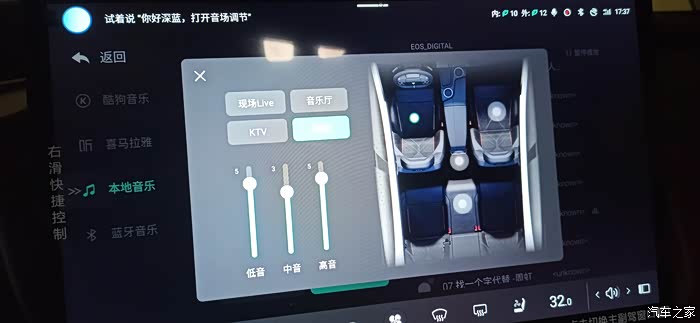长安深蓝拥有14个SONY喇叭,但是有些人反应音质效果没有达到预期,其实问题是出在音源上。如果是用车机上面的酷狗播放,只有左右声道,码率也不够,播放出来的音质就感觉平平,不够惊艳。这时候你只要用U盘,下载无损音源 ape、flac、wav、dts格式,插到扶手箱底下的USB接口,然后在播放页面,调整下为影院模式,把低音设置为5,中音3,高音5, 把中心位置设为驾驶位。各种模式呈现的效果略有不同,可以根据个人喜好进行选择,点击本地音乐,右边显示的就是U盘里的音源,也可以在U盘里建文件夹进行音源分类,点击曲目就可以播放了。这时候可以开始享受听觉盛宴了,14声道让你有一种身临其境的感觉。我整理的一些无损音源,有需要可以评论区留言。