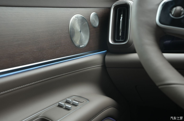 鉴赏完外观,进入车内体验座舱,高档真皮材质打造的内饰比起人造皮革手感好太多了。顶棚选用触感细腻、质感上乘的麂皮覆盖,车门板上镶嵌一大块实木装饰,低调又奢华。水晶旋钮、星环散射体、三联屏等配置,经典依旧,科技感拉满。