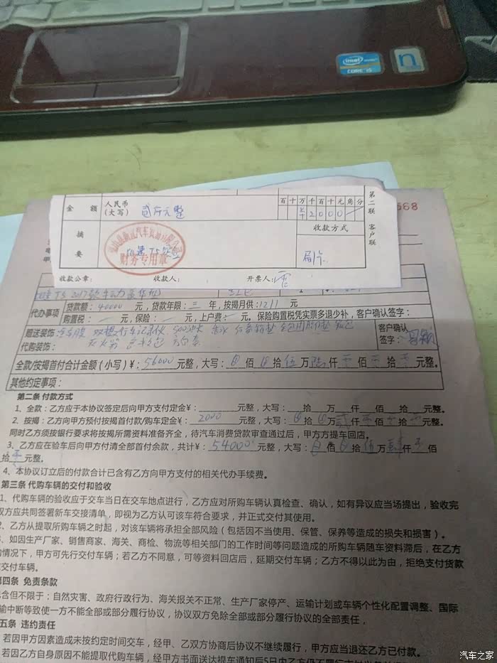 人生第一辆车选择了北汽威望M20,伴我3年多,无任何问题,但是今年2月一次事故让我萌生了换车的念头,雨天爆胎,还是左后轮,人没事,车车大修,地盘以下全换,洋洋洒洒的4大页配件更换,维修后车确实不好开了。故选择换车,本来打算更换斯威X7,价格也谈妥了,奈何四儿子死活都不愿意把谈好的写进合同,包括首付多少,按揭多少!!都准备交订金了,结果闹了这出,而且几个四儿子都这样,故放弃斯威,转投T5,期间CX70外形就直接放弃,580就在我们宿舍不远,里面也有朋友,貌似问题也很多,故还是放弃,综合考虑后选择T5。记得还是7月12号在路上看见一个白色T5,觉得确实不错,外形在路上还是可以,故直接去县城店里订车了,优惠1500,送记录仪,油卡,全车脚垫,全车膜,套子,香水,炭包等等小玩意儿。8月8号提车,期间各种手续,耽搁不少事,早知道就该借钱全款,贷款太麻烦了!!!!