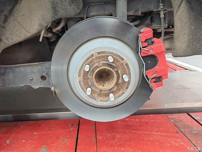拆下轮胎可以看到刹车盘还是非常光亮的,但是法兰盘的位置有些许铁锈