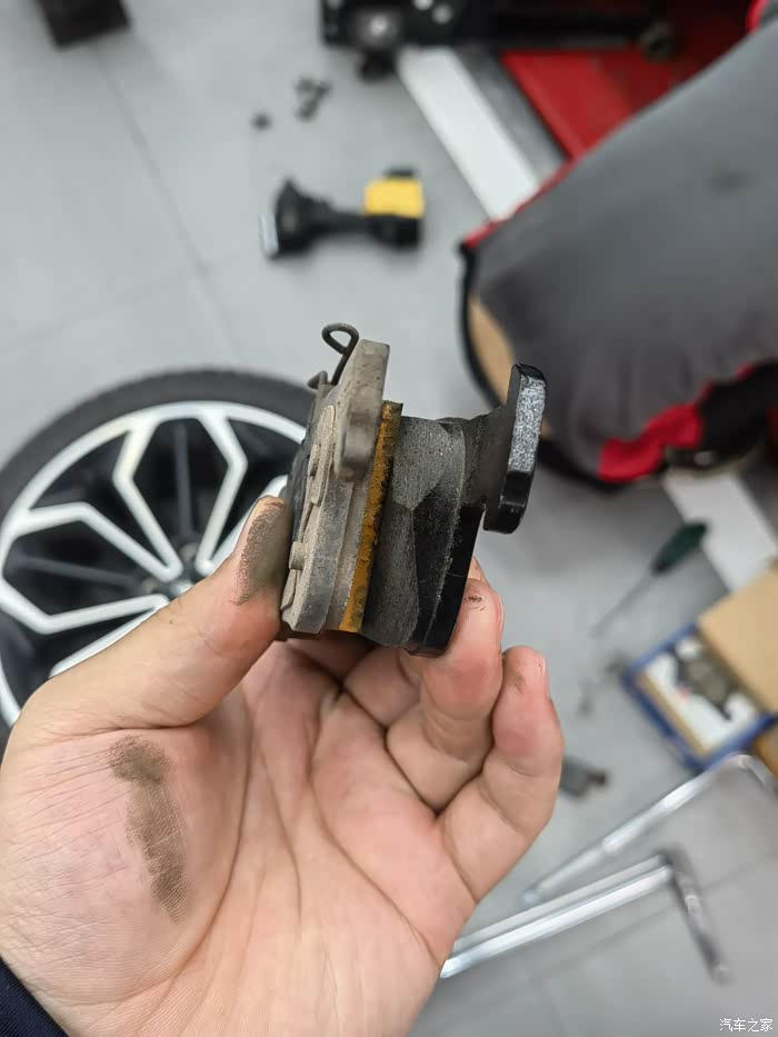 可以看到换下来的刹车片大概还有一半的厚度,也就是还有3-4万公里的寿命,但是为了解决异响,这次就提前更换了,换下来的旧件保留着备用