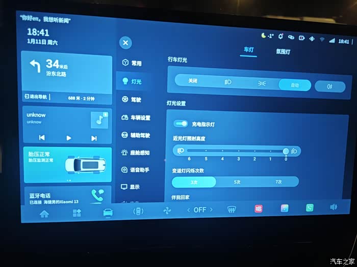 灯光控制也在屏幕里调整,008默认开启自动大灯,既是在车机调整过,重新启动车辆后还是会回到默认自动大灯状态,这一点还是比较好的,远近光控制还是保留了物理控制方法,基本不影响正常的使用。