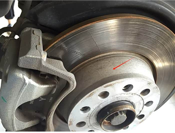 你描述的应该是箭头这个部位,这个地方长点锈正常,上面有摩擦的部分才是刹车盘,那个车一开踩两脚刹车就亮了。