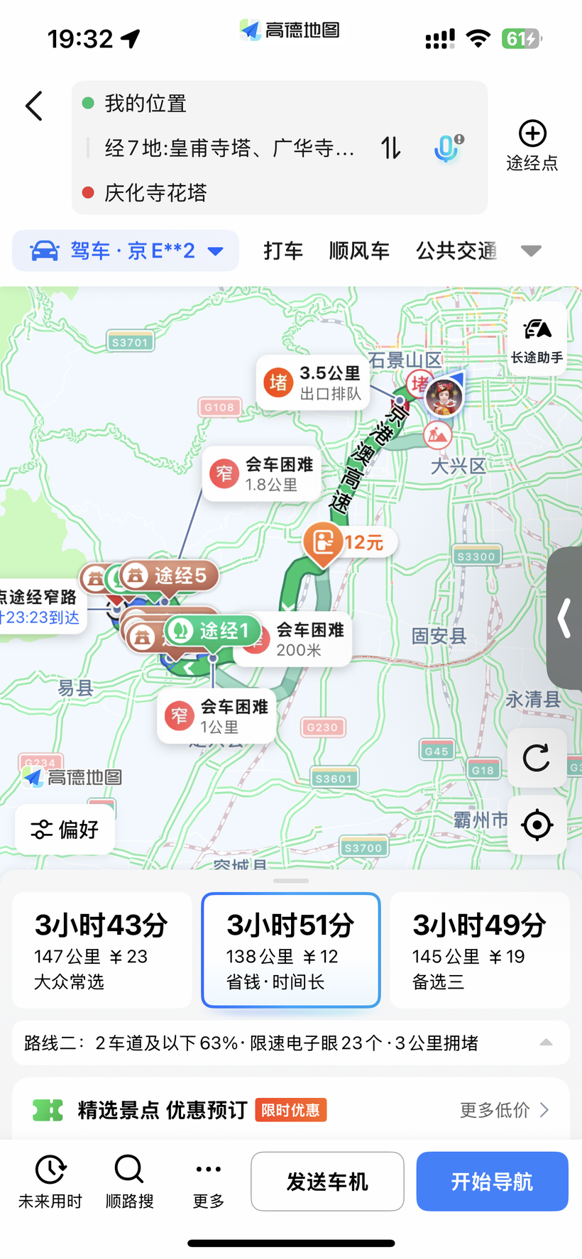将“小白”停在山脚下,轻装上阵,开始了徒步有氧攀爬,经历了半小时,最终在下午两点到达,探寻打卡完毕后,下山与“小白”汇合,返程导航,给出三个选择,由于时间尚早,最终我选择了全程国道方案,免费的同时,还可顺道一观路上风景。