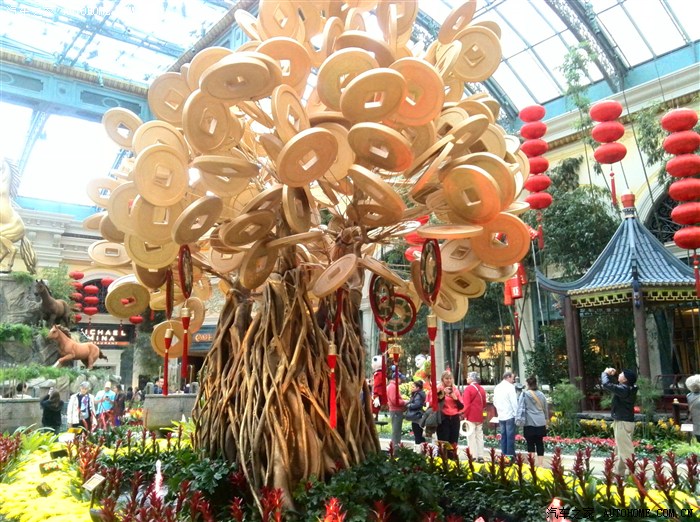 到了晚上,然后开车去MGM米高梅酒店看魔术表演去。MGM也很大,从停车场走到演出的地方,走了有十分钟多吧。酒店中厅也是中国元素的新年标记。