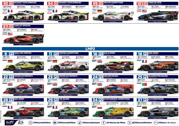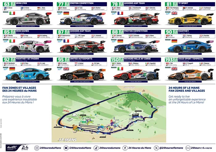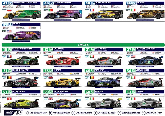 在参赛车队方面, Hypercar组别共有21辆赛车确认参赛,LMP2组别作为单一规格的组别,今年将迎来17辆赛车参赛,回归其在 WEC 赛季中唯一的一站比赛的舞台。LMGT3组别今年迎来了其在勒芒和 WEC 的第二个赛季,共有24辆赛车参赛,成为今年参赛阵容最为庞大的组别。