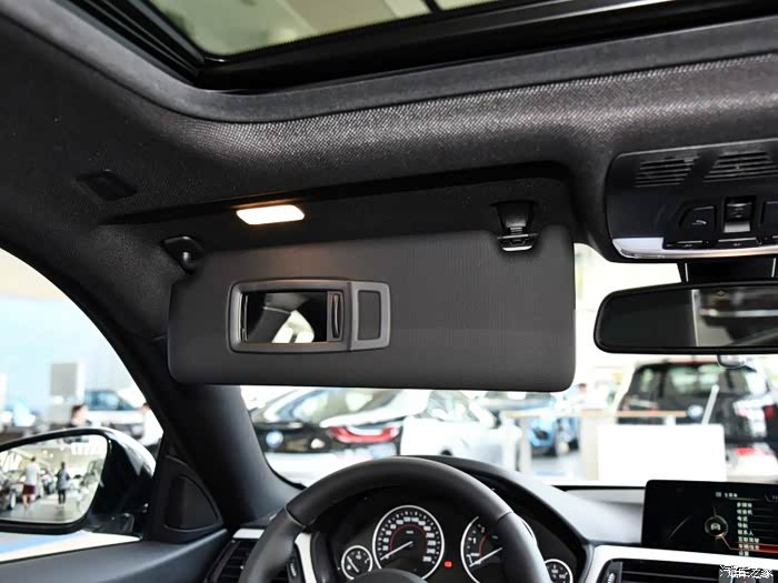 - 宝马只有一块遮阳板,不能同时遮挡正面和侧面的阳光,揭开以后有化妆镜和名片夹,门侧面没有扶手,所以整个车顶看起来比较简洁,前侧车顶处还有麦克风,便于免提通话,化妆镜,阅读灯目测是卤素灯泡,不是LED,某种意义上来说就拉低了整车一个档次。