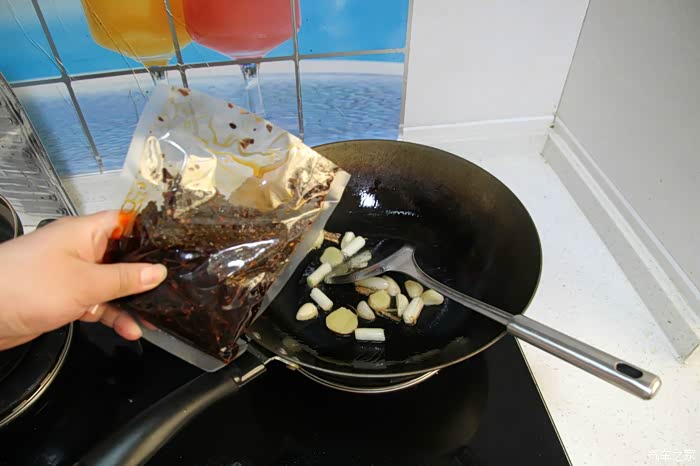 将麻辣香锅底料剪开,倒入锅中,这个牌子的底料和海底捞的相比貌似辣椒之类的比较多,做出来发现也确实如此,比海底捞的要辣