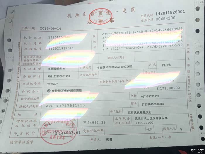 因为我急着用车,4S的销售总监是最后才知道是我老乡,就我们村隔壁的!唉~最后跟他说了半天,因为人多,要风尚白的很多,要等到10月10号才能有车,还不能保证!唉~最后说有台原来大厅的展车,放了一个多星期,加装了一些东西,我说没加装导航就可以~去了一看就加装了真皮!就这辆吧~直接为了省心其它的全加了~价格你们猜~最后导致了后面的左前叶子板上面被石头打了小坑~仔细点才看的清楚~都说无所谓,谁希望自己买的新车,20W的大件啊!有个瑕疵总是不爽的啊~唉!为了现车~下面的来了~
