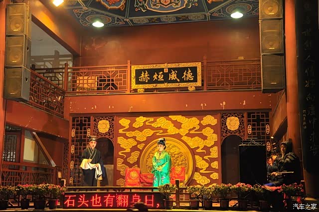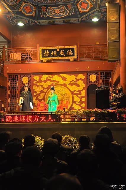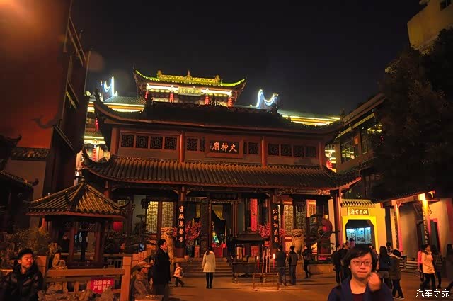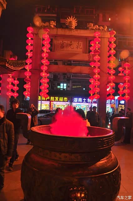 在长沙,如果你问到坡子街,或许有人不知道;但要提到火宫殿,那可是无人不晓的。火宫殿的夜景要比白天绚丽多彩,美不胜收。四周装点的霓虹灯相映生辉,门口是一面高大的石门楼,穿门而入,正中央映入眼帘的是一座雕龙刻风,精美绝伦的古牌坊,上书“火宫殿”三个金色大字,进门再看牌坊的另一面,书写的却是“乾元宫”,难怪老长沙有句“进门火宫殿,出门乾元宫”的俗语,这个“乾元宫”又与长沙方言“钱圆功”谐言,一语双关,可见这里历来就是一个消费场所。牌坊之内,有小工艺品摊,地方特色,琳琅满目。左右两厢分别是小吃行与茶馆,最里面便是重修的火神庙,庙里陈列着不少文物。紧挨着火神庙,是一座金碧辉煌的戏台,装扮的五彩斑斓。戏台上正唱着古装曲戏,台下休闲的椅凳坐满了听戏的游客,这可比白天过来有意思多了啊,我手持相机拍个不停。