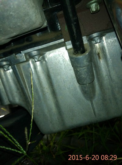 这张是换油的前一天,用手机拍摄的油底壳,因为我是用抽油器抽机油,所以我想着,如果把车子停的前低后高,是不是能抽的更干净,随意拍摄了这么一张图片,这根黑色的是机油尺的通道。