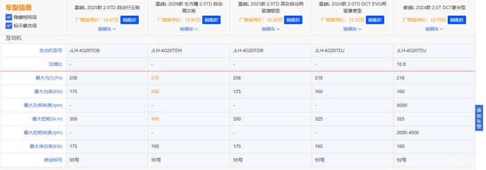 看上图,几款发动机只型号一样,只是小型号区别,应该是调校不同。