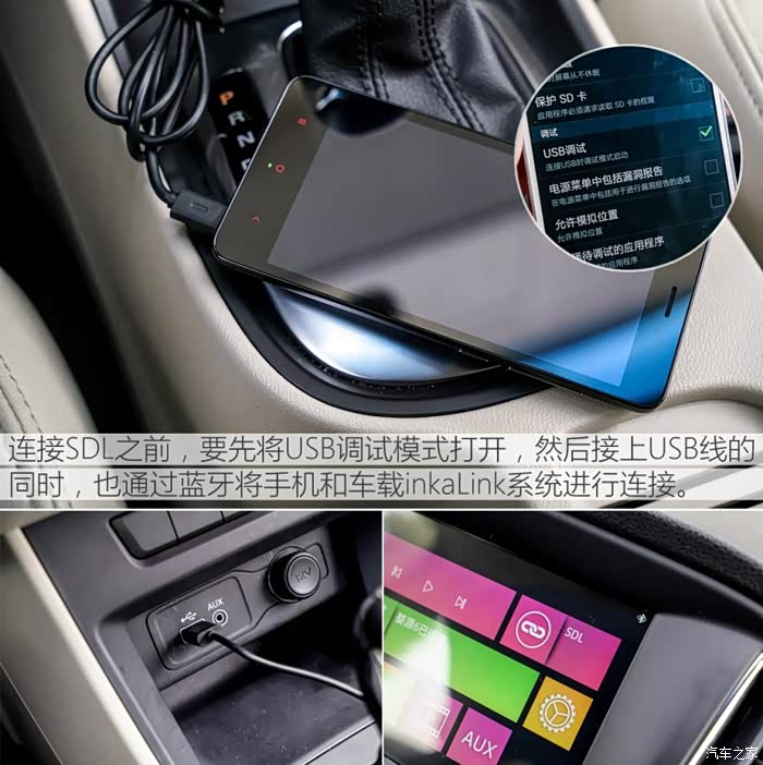 使用SDL智能互联需要进行两步操作:1.打开手机蓝牙,并与车机完成连接;2.打开手机的USB调试模式,然后通过数据线将手机接入车机。