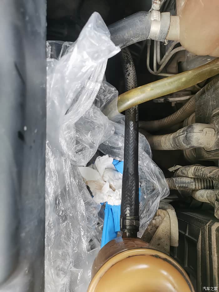 上次是两年前换的,用针筒抽把助力壶内的油抽出来的。记得当时换完油的颜色只是变没有那么黑了总感觉换的不彻底,这次换种方法就是直接拔掉回油管更换。