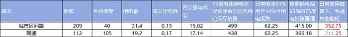 假设全程高速路行驶的话,车辆其他功能使用情况保持一致,理论上能行驶366公里(计算方式同城市区间路通行方式),但实际应该只能行驶300公里的样子,这个数值和我之前全程高速的测试结果基本一致。
