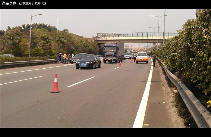 前天(3月25日)上午,我跟我老婆带个外国客户从广州到深圳看产品,走广深高速。一路上风和日丽、阳光明媚,广深高速车流量很大。11点左右,在龙大高速快到龙口出口段我时速100走在超车道上,看到应急道上有辆本田商务车后尾撞很严重,就测目多看了几秒。就这几秒,差点让我玩完,我刚收回视线就看到前两米处有个红色三角牌,还没是明白怎么回事车就直接撞飞三角牌,还没反应过来这怎么会有三角牌,就看到前面二十来米停着一辆大货车,我的天啊,心里立刻知道大事不好了,下意识的马上踩刹车,车速略有下降但于事无补,直勾勾看小车撞上去。我心想这下麻烦大了,经常在新闻里看追尾大货车的,结果都是相当的杯具。。。