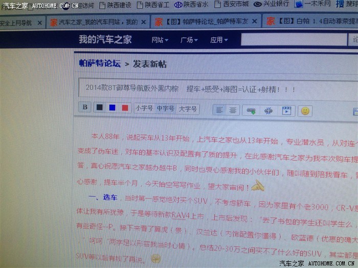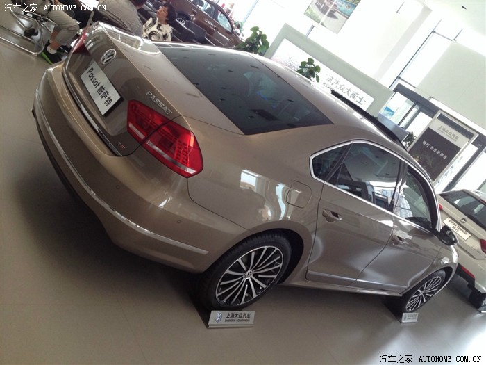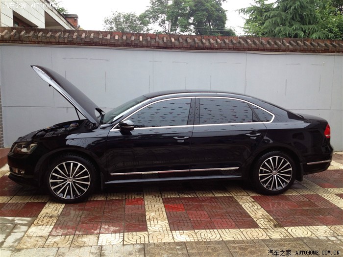 于是将目光转移到了轿车上,本人喜欢大空间所以基本看的都是B级车,雅阁九代(好车,姐夫已买)、蒙迪欧(好车,屁股变化些会更好看,适合20岁开)、迈锐宝(内饰做工粗糙)、凯美瑞(该换代了)、迈腾(试驾2.0T,的确猛但是还是喜欢帕萨特样子,无理由)、去年那会看过帕萨特御尊版,配置比较满意,唯独喜欢18寸放射轮毂,想着当时如果买了就换套轮毂,谁知道,谁知道14款竟然出了御尊导航版,比原有的御尊版多了原厂的18放射轮毂、导航、LED迎宾 ,只多了3000块,综合考虑:同等价位,品牌响亮,配置丰富,性价比高,于是5.1车展用了2分钟定了车,接下来就是漫长的等待以及一系列的无厘头事件,就不一一说了 ,说了再有3万字都说不完,车已经提了,忘掉之前的不愉快。优惠1.5,送全车膜,送...........(此叙述其实已经省略的10万字,小伙伴说应该全市的4S点都认识我们