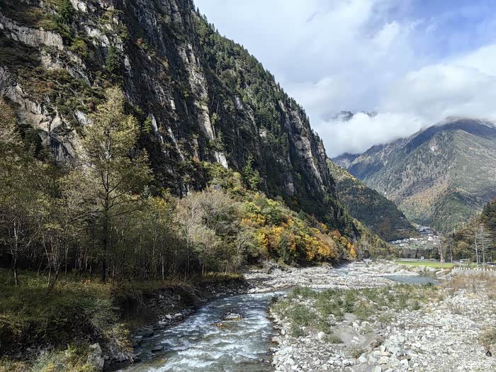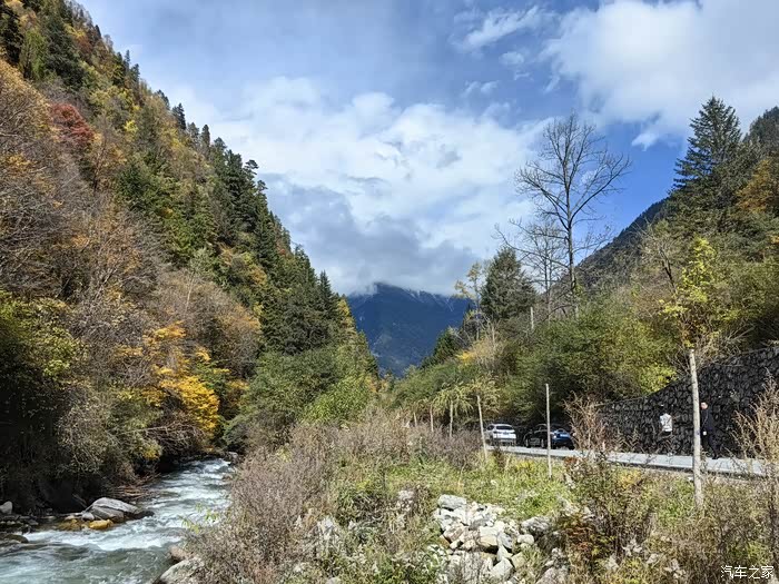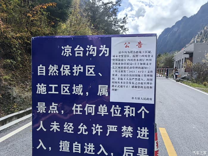 办理完入住手续,看天色还早,就按照网友介绍的非景区凉台沟出发,一路沿着小溪在前行,秋天的彩林在两边呈现,景色让人流连忘返,可惜的是,还没有行驶多远,就被一个告示和横杆拦下,告知前方施工,禁止通行,据成都网友说,十一假期期间还开放,好像后续阿坝州里下发一通告,所有免费网红景点,因为安全问题都封闭了,哎!阿坝州吃相太难看。