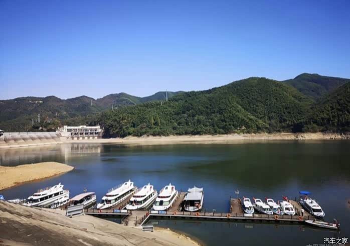 佛子岭水库,数月干旱,水位锐减,游轮整齐的排列在湖边。