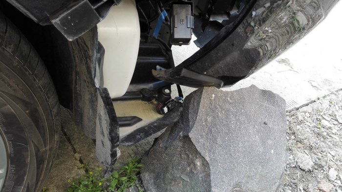 标题中说有惊喜,其实惊喜就是此次上山撒野结束后,返回途中,农村水泥路上在一个弯道倒车会车,没注意路边的石头,结果硬生生的把前包围给刮下来了,话说当时哗啦啦啪啪啪的撕裂声,我的心都碎了,上山撒欢都没事,快到家门口了出了这么个状况,我的心情无法用语言表达。