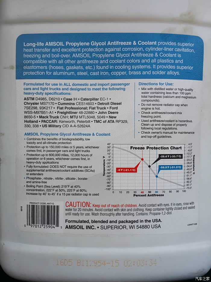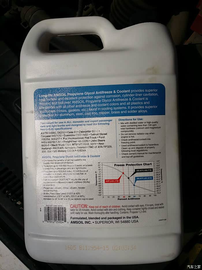 下面再说说防冻液吧,之前换的是安索丙二醇防冻液,这个成分区别于普通防冻液乙二醇,普通防冻液是水性的,有毒的,对环境有污染的,一般2年左右要求更换,安索这款丙二醇是无毒的成分,丙二醇经常用于化妆品的保湿成分里,对环境是无污染的,而且寿命也是很长的安索允许7年更换一次,这个防冻液属于油性的,状态类似低粘度机油。