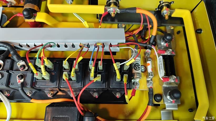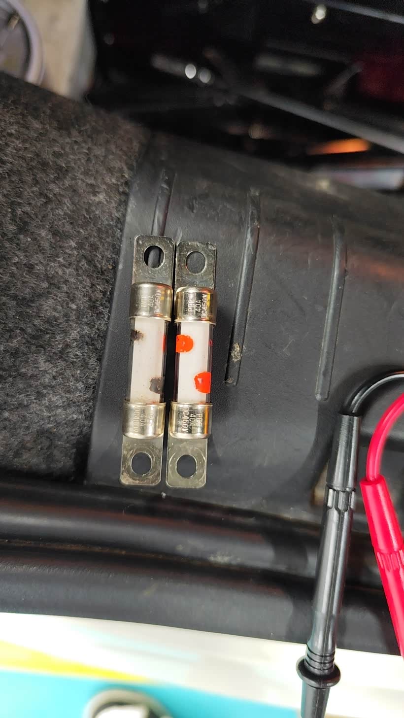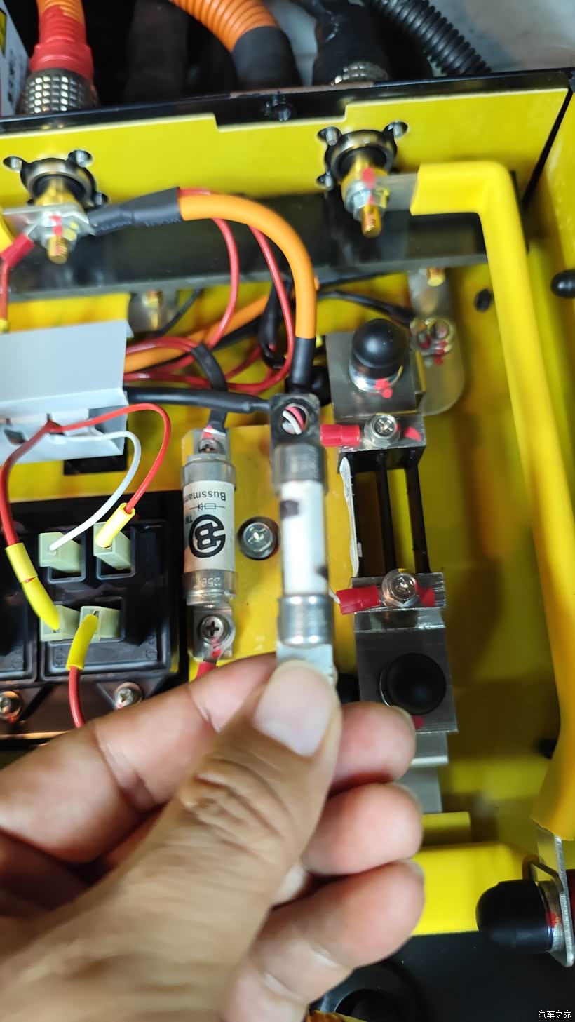话不多说,充了一会电,自己停了,再充充不上,启动不了,估计是快充保险烧了,和上次一模一样,同一个地方,同品牌的桩,这次一点没慌,拖车也用不着,打个车回家拿保险配件,回来换上就行了。前辈们让用表测测,我把表也带上,一测没声音,果然是烧了都黑了,正常是桔红色代表40A,坏的都黑色了。