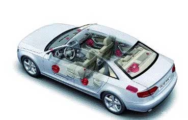 中置中音喇叭1个,仪表台两边高音喇叭两个,前门中低音喇叭2个,后门拉手位置高音喇叭2个,后门中低音喇叭2个,后备箱还有一个重低音喇叭。如此便构成了奥迪标准的10喇叭系统,也就是我们经常所说的5.1系统,即:四门立体声+中置+超低音的5.1音响系统。