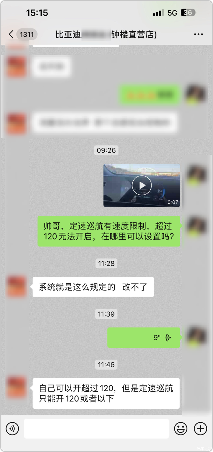 我开过各种品牌的车子,可以说市面上流行的基本上都开过(奥迪、宝马、别克、雪佛兰、大众、奔驰、捷豹、丰田、本田、中华、长城、现代、比速、日产,能想到的开过的就这么多,也许还有其它的,不过能说明问题了),从来没听说过定速巡航的速度还设置上限的,只比亚迪一家。话说得丑一点,买车之前要是知道比亚迪有这个限制,我根本不会买的(个人习惯,高速上在路况好的情况下,我一般肯定会定速巡航130一直跑的,长时间驾车腿脚不会酸,比一直踩着油门要舒服太多)。
