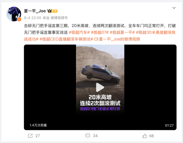 夏一平有时一天能发四五条短视频,在抖音累计获得42.7赞,有七条短视频的点赞量过万。今年9月4日,夏一平在直播中将一台极越07从30米高的坡上连续推下来两次,进行极限跌落测试,获得600万播放。