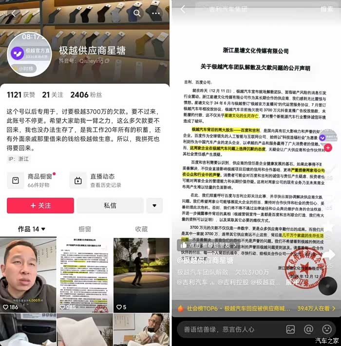 12月11日,有媒体发文称,新能源汽车品牌极越拖欠传播供应商款项36万元。另一位自称媒体供应商浙江星塘文化的网友发布视频称,极越拖欠了3700万元的抖音直播广告投放垫款,视频中包含公章。这笔欠款来源于该网友抵押房子、工作20年的积蓄,以及从亲戚、家人借到的2000多万元。