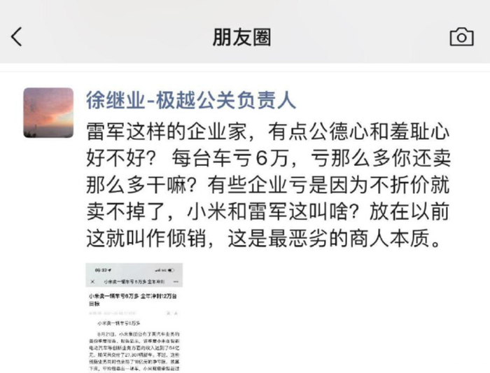 比如夏一平称,极越07是一款超千亿研发投入的轿车,但是所谓的“千亿研发投入”是指百度、吉利、宁德时代三巨头的研发投入。更广为人知的则是极越对小米的“碰瓷”,在小米发布财报以后,极越公关负责人炮轰小米“卖一台车亏6万,还卖那么多干嘛?”