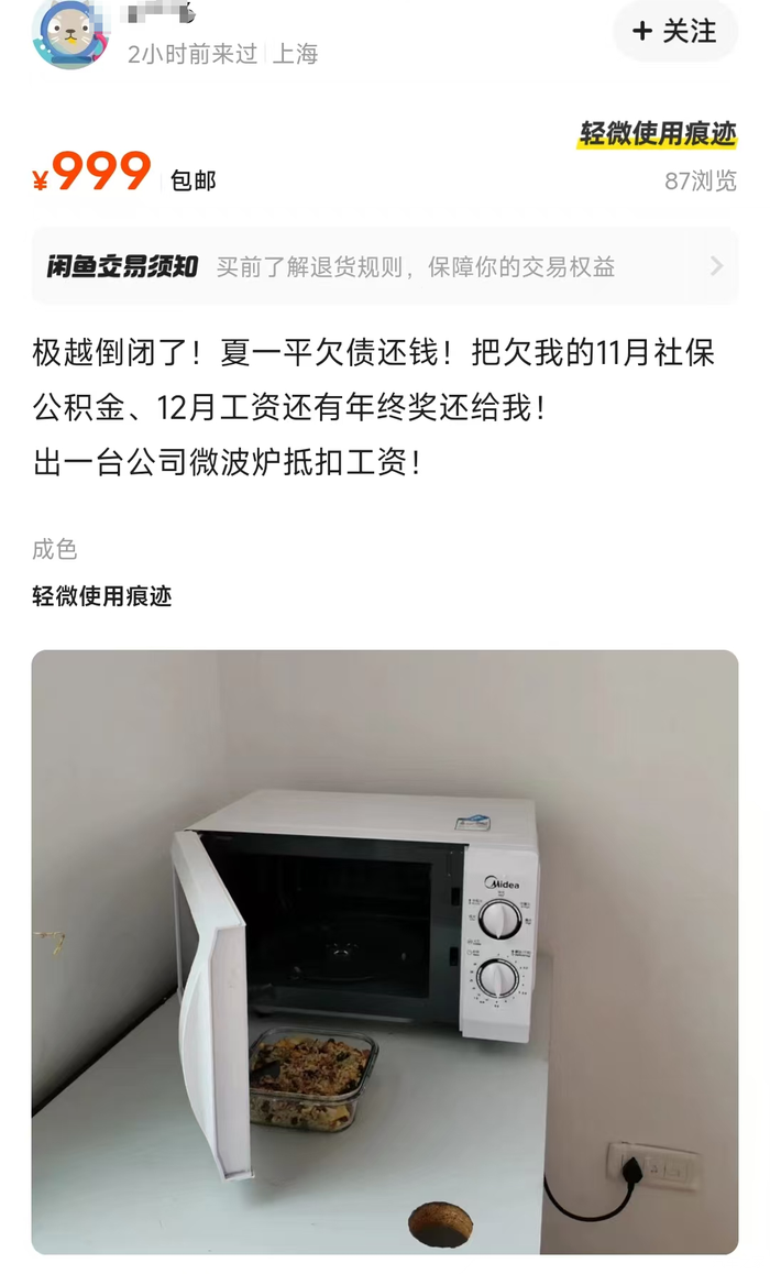 一些门店也以“极越最后一次直播”为标题,借助这场热搜事件的流量,直接在直播间内求职,甚至有女主播在线化妆、准备另一家车企的面试。员工走的时候不忘把公司的纸巾、微波炉带回家,甚至把微波炉挂到咸鱼上。