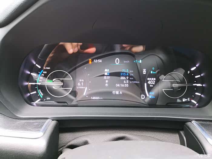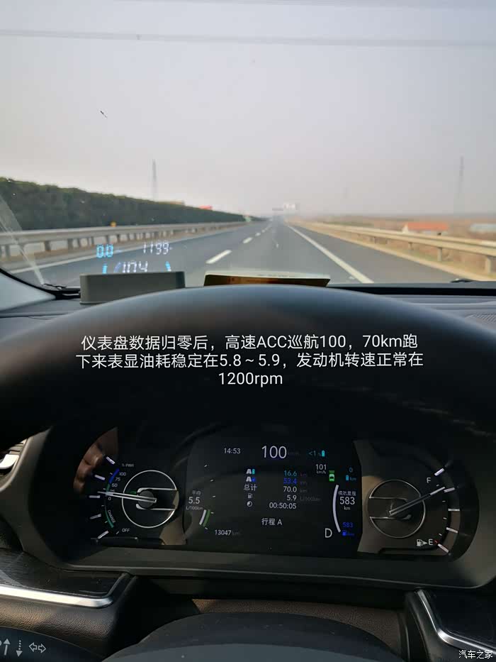 5、续航长,目前上市的PHEV车型,还没有任何一款能够与之匹敌。与丰田类似的行星齿轮混动系统成熟且效率高,12.95KWH的电量纯电续航70km,是同级别插电SUV车型里面纯电驱动效率最高的,甚至高于很多纯电轿车;再配上56升油箱,和低至7升以下的馈电油耗,满油满电续航标称900km,实际驾驶轻松就可以超过800km,国道驾驶时速100以下,可以超过1000km。前几天我专门测试了100km/h时速ACC巡航的油耗:一直在5.8~5.9l/100km之间波动,发动机转速一般在1200RPM(见照片)。