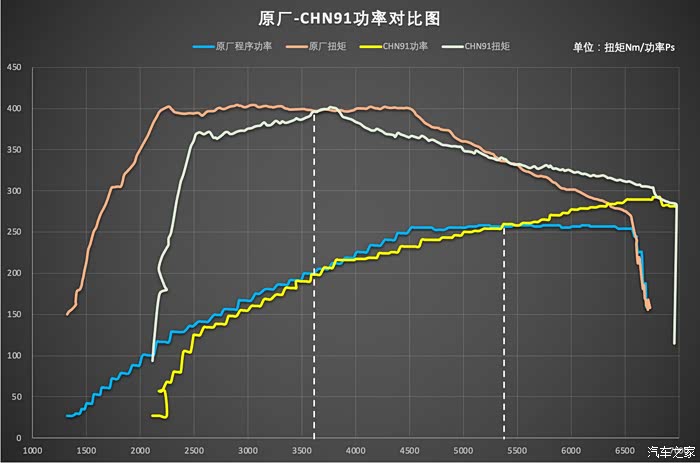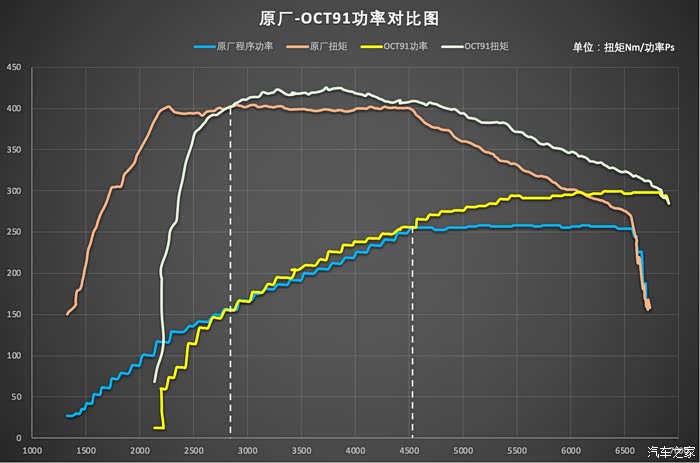 就上述程序的功率曲线,我们假设时间=转速,4500转到6800转为发动机工作区间(Sport Plus S档2换3、3换4差不多是在6800换挡掉到4500转),通过积分计算,在此转速区间内较原厂程序相比,CHN91提升约为10%,ACN91提升约为14%,OCT91提升约为19%。