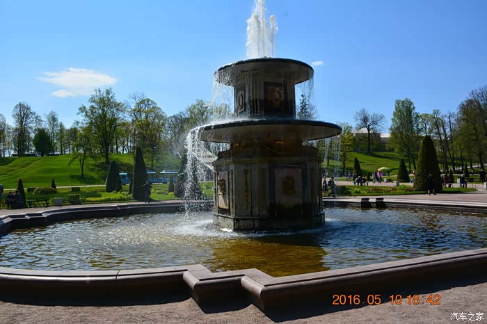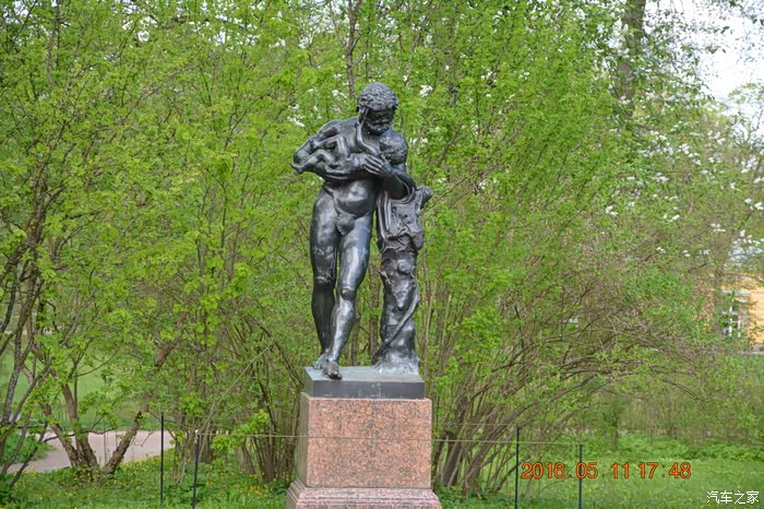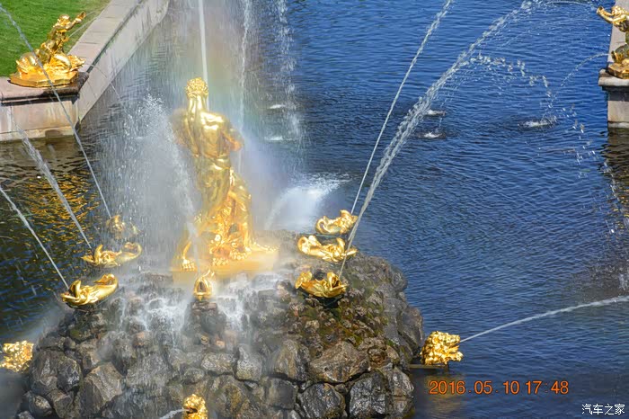 在喷泉群的圆形水池中央,耸立着《圣经》中描述的大力士参孙和狮子搏斗的雕像。大力士双手把狮子的上下颚撑开,泉水从狮子口中冲天而出,水柱高达22米。