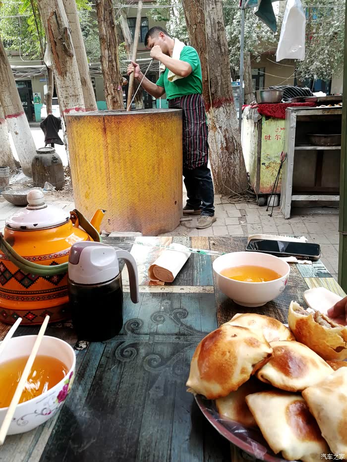 午餐。一小镇路边,守着烤炉吃刚出炉的烤包子,又烫又热!