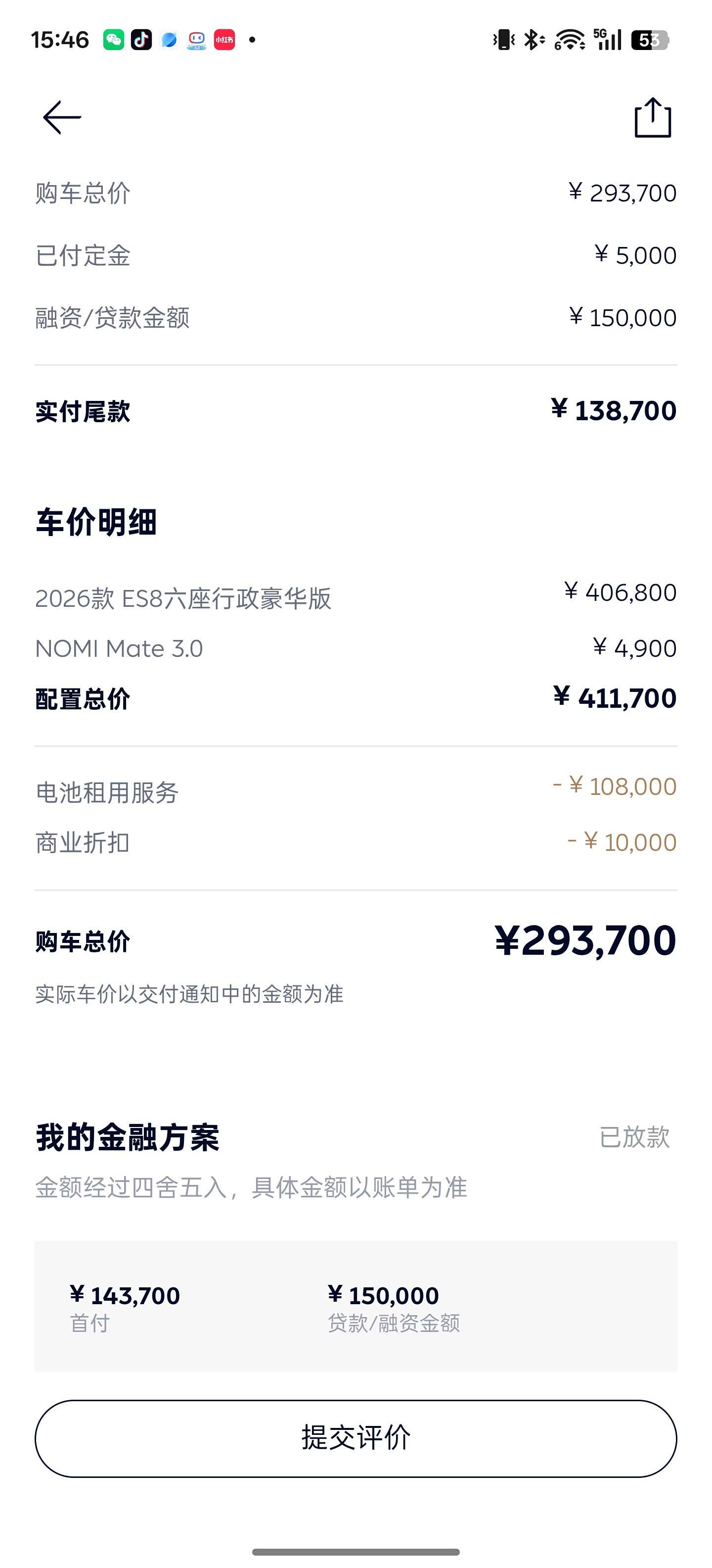 我选择的车型是es8豪华版。裸车不带电池的价格是306800,当初还在犹豫是租用电池还是买断,但经过了几天几夜的研究,我最终还是选择了电池租用,一来是自带电池保险,所以你电池磕了碰了,其实保险都会为你买单,二来是因为电池租用服务和买断电池的价格其实跟随着时间的年限,价格都会有所降低,所以如果到时候电池不排除以后有降价的可能,到时候再买断也不迟。保险的话,经过多家对比以后,其实还是选择了太平洋,保险费用是8800多。第一年的话,我还是建议大家把第三者买到300万。这边的上牌费用基本上没有可以忽略不计。因为还有交5000抵1万活动,我也没计算出最终交了多少钱,大概30万左右吧。既然上到这么贵的车了,所以贴车衣我认为也是理所当然的,也是花了好几天研究车衣,最终选定了某品牌的车衣和车模。贴完后我认为非常的完美。当然黑车如果贴了,那效果更好,白色其实也可以贴,小剐蹭完全可以防护。我从提车到现在被电动车刮蹭了一次后视镜。被网约车刮蹭了一次门把手。因为车衣的功劳都给我防住了,没有任何痕迹。